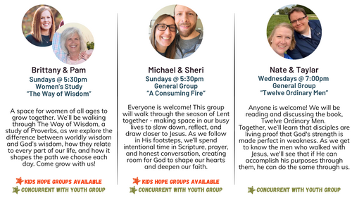 This season will be filled with groups that focus on a unique material for 6-9 weeks. Each group leader will select their material and guide the group through it. Sign up for the Spring season early in the new year.